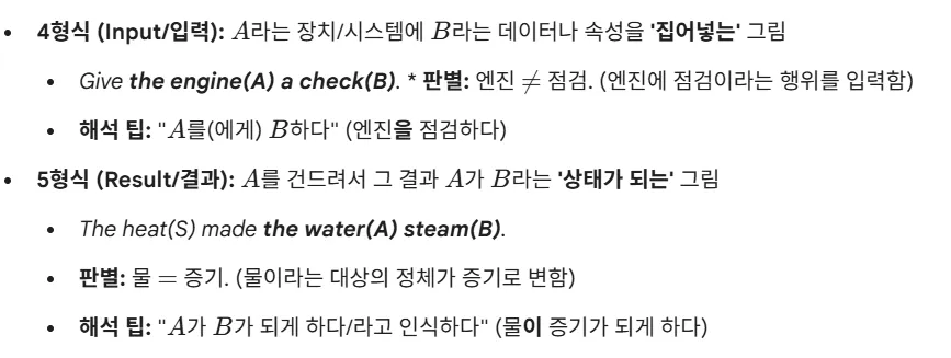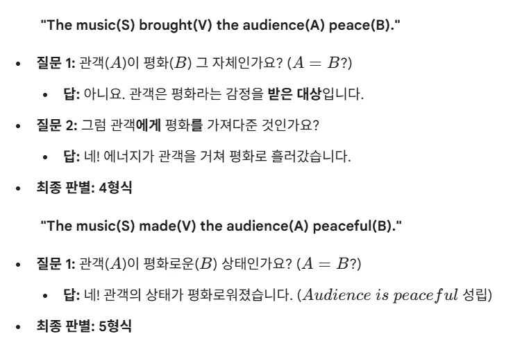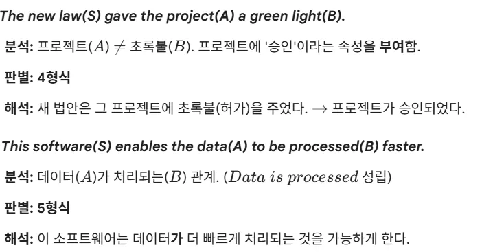 이외에도 B 자리에 추상적인 개념이 올 때는 문장 형식을 판별하는 게 조금 난해할 수 있지만, 그래도 A와 B의 관계만 제대로 분석하면 문장 형식을 정확히 구별할 수 있다.