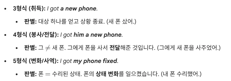 위에서 보듯이 떠나다라는 의미를 지닌 Leave라는 동사는 문장 형식에 따라 해석 시에 뉘앙스가 달라진다. 특히 아래와 같이 Get이란 동사는 애당초 많은 의미를 지니고 있다보니 문장 형식에 따라 적절한 뉘앙스를 표현해야 한다.