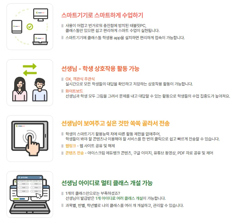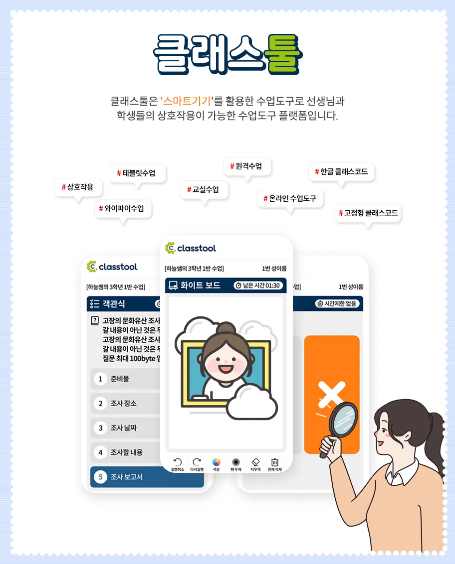 교사와 학생이 함께 스마트 디바이스로 상호작용 수업활동을 할 수 있는 대화형 수업 도구인 클래스툴은 수업의 시작부터 마무리까지 가능한 올인원 수업 도구 플랫폼이다. 특히 별도의 설치 없이 웹브라우저부터 모바일 또는 태블릿에 애플리케이션을 설치해서 언제 어디서나 스마트한 수업이 가능하다.