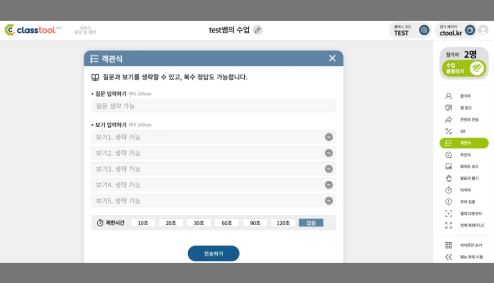 참고로, 앞에서 언급했듯이 학생은 별도의 회원 가입 없이 웹 브라우저 접속 방식 또는 모바일 클래스툴 앱으로 수업에 참여할 수 있는데, 이때 학생들은 선생님 화면 상단의 클래스코드를 클릭하거나 QR 코드를 촬영하는 방식으로 수업에 참여할 수 있다. 이때 선생님이 알려준 클래스코드를 입력하기면 하면 수업에 참여할 수 있으므로, 한 공간에 있지 않아도 원격으로 수업 진행도 가능하다.
