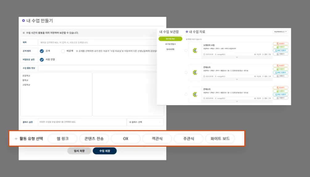 우선 선생님이 클래스툴로 접속한 후에 클래스를 생성 한 다음에 추가로 수업을 만들면 되는데, 즉 여러 클래스를 생성할 수도 있고 하나의 클래스에 여러 개의 수업을 생성할 수도 있다.