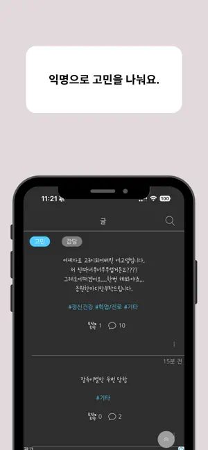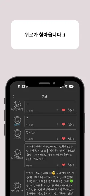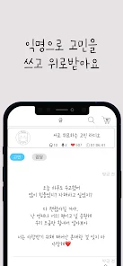즉, 앱을 실행한 화면에서 바로 글쓰기 버튼을 누른 후에 연애, 가족, 진로, 우울, 잡담 등 다양한 카테고리로 나뉜 고민 방을 선택해서 쓰고자 하는 내용을 기재하면 된다. 해당 고민 글을 업로드하면 다른 이용자들이 위로하는 댓글과 함께 하트 또는 공감을 눌러주므로 그 자체로 위로를 받을 수 있다.