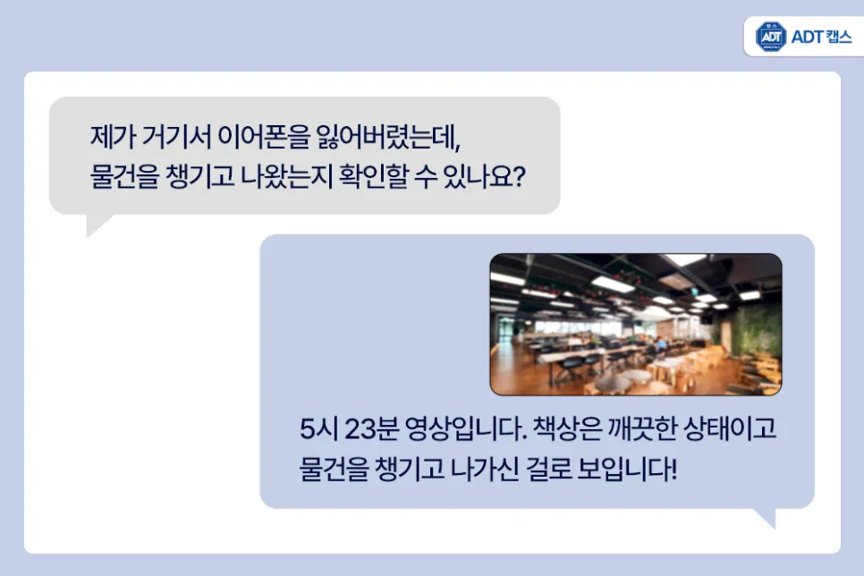 더불어 ADT 캡스 기술력을 집약한 영상 보안 솔루션으로 서비스하므로 단순히 CCTV로 촬영하고 녹화하는 기능을 넘어 실시간으로 현장 상황을 보고 필요시 원하는 영상만 찾고 분석하는 지능형 기능까지 활용할 수 있다.